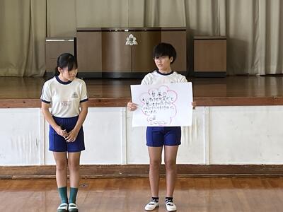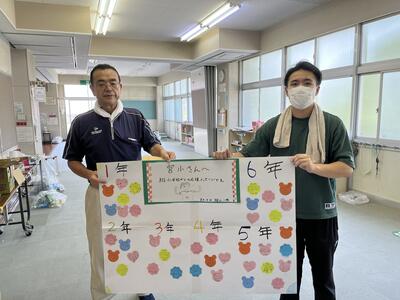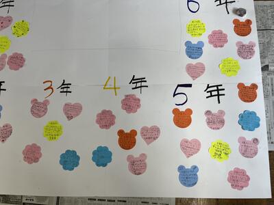 今日は6年生が全校生に呼びかけて、宮小学校の児童の皆さんに応援メッセージを作りました。大休憩の時間に全校生が体育館に集まり、6年生の指導のもとにメッセージカードを記入しました。その後、休み時間やお昼の時間を使って、心のこもった掲示物に仕上げました。校長が学校を代表して、宮小学校の職員に届けました。6年生のリーダーシップと団結力は素晴らしいものでした。宮小学校の先生方も感激していました。