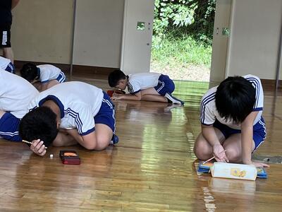 トレーニングの後、各登校班に分かれて、安全に通学するために、確認と反省をしました。