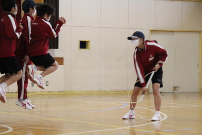 1,2組の体育では、雨で校庭が使えないため、体育館での長縄練習が行われました。床での跳ね返りが大きく、校庭よりも記録は伸びないものなのですが、一生懸命取り組んで記録を伸ばしていました。