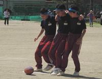 3人4脚でラグビーボールを蹴って次の組へ。待って~、ボール!