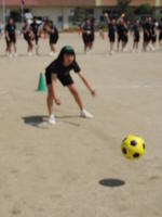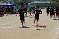 ボールを2つつなげ、2人で蹴りながらリレーしました。