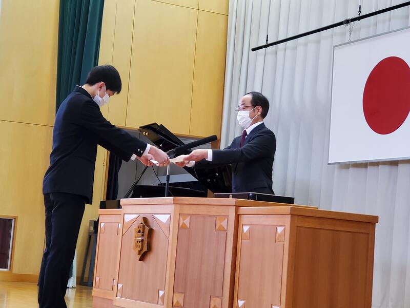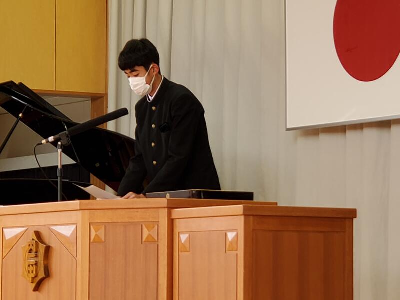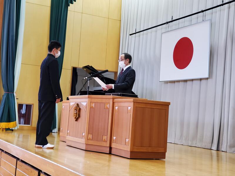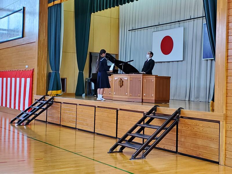 今日は修了式が行われました。修了証書授与の後、校長先生からの式辞では、「諦めないでチャレンジを続け、勝利を勝ち取る」ことについて、それぞれ進級する1,2年生に向けてメッセージが送られました。また、今年1年間欠席なく登校できた生徒に精勤賞が渡されました。
