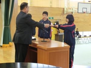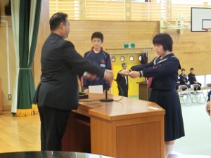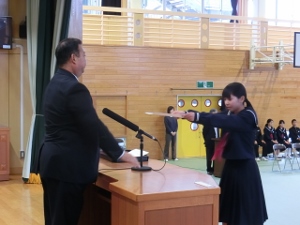 生徒会総会に先立ち、各専門委員会の委員長、副委員長、書記、そして、学級委員長、副委員長、書記、会計の任命式が行われ、代表生徒が任命書を手にし、その後、それぞれに任命書が渡りました。