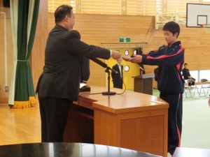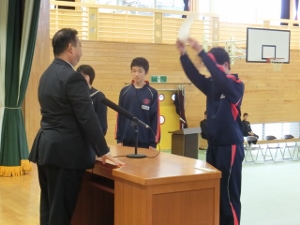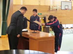 2016年5月18日 17時43分 生徒会総会に先立ち、各専門委員会の委員長、副委員長、書記、そして、学級委員長、副委員長、書記、会計の任命式が行われ、代表生徒が任命書を手にし、その後、それぞれに任命書が渡りました。