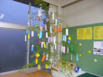 笹竹を教室に設置し、笹の葉に願い事の短冊を飾りました。