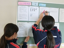 21日(水)、22日(木)に行われる期末テストに向けて、中体連から気持ちを切りかえて、学習に励んでいます。朝の時間や昼休みなど、時間を大切にして学習する生徒が多いようです。生徒会本部役員の予想問題を実施する生徒もたくさんいます。