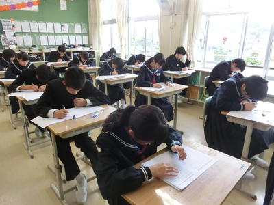 2学期の中間テストが始まりました。今回は、理科、社会、数学、国語、英語の順にテストが行われています。テストの問題は、授業で学習した内容ばかりです。教科書にマークした大切な語句やワークなどの問題演習を思い出しながら、チャイムが鳴り終わるまで解答に取り組みましょう。