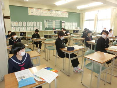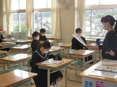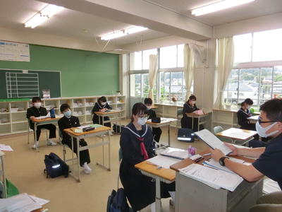 2020年5月18日 09時15分生徒の皆さんの元気な姿を見て、安心しました。各学年とも2つの教室に分かれて「3つの密」を避ける工夫をしています。