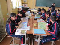 2年生は美術の授業中です。絵を見て感じたことなどを書いたり、絵を描いたりしました。