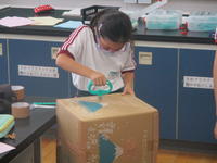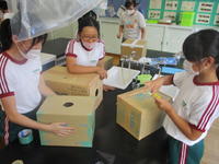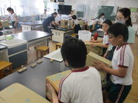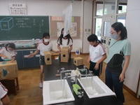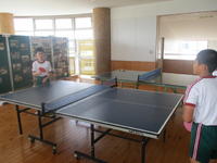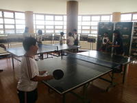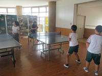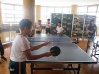 校庭では、運動クラブがソフトボール、理科室では、科学クラブで「空気砲」づくり、2階ホールでは、卓球クラブが、ラリーを行っていました。