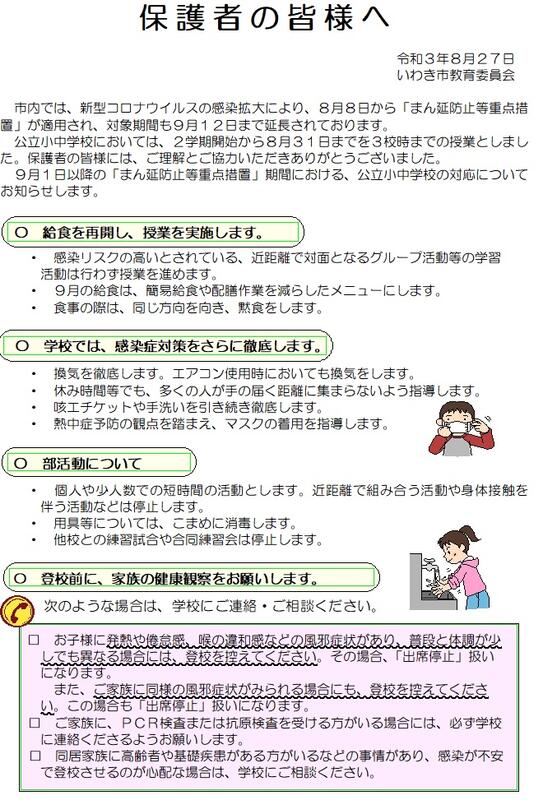 9月1日以降の「まん延防止等重点措置」期間における公立小中学校の対応について内容をご確認下さい。