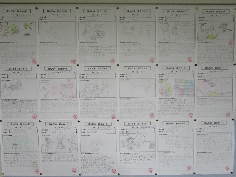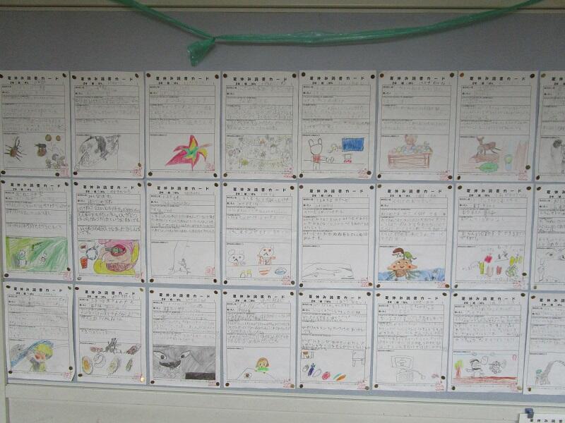 廊下には夏休みに読んだ本を紹介する「紹介シート」が掲示されている学年がありました。