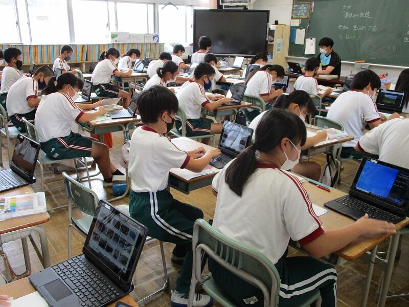 また、本日「学習端末の活用について」プリントを配付しました。以前からも紹介していますが、市内の小中学校の児童生徒1人に一台ずつ学習用タブレット端末が整備されています。今日も設定を少しずつ進めているクラスも見られました。