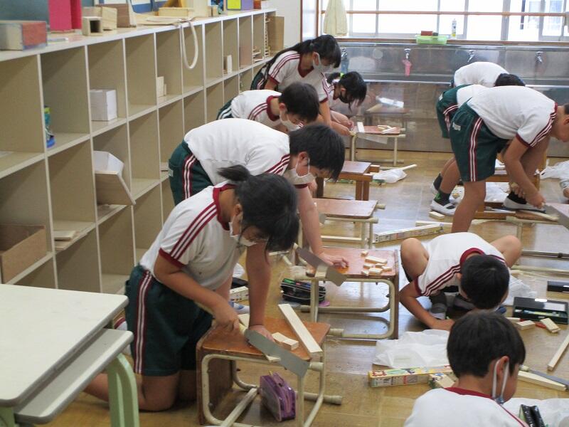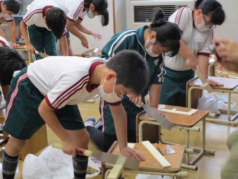 校舎内では4年生が図工でのこぎりの使い方を学んでいました。