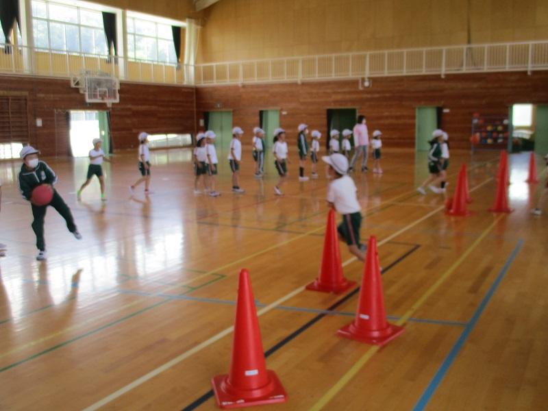 2年生は、体育館でカラーコーンを的として投げる力を高めていました。みんな上手に当てていました。