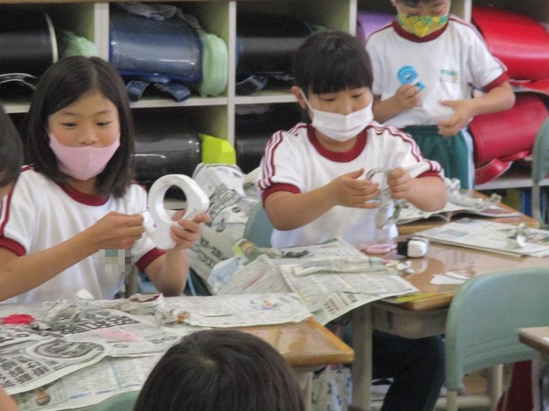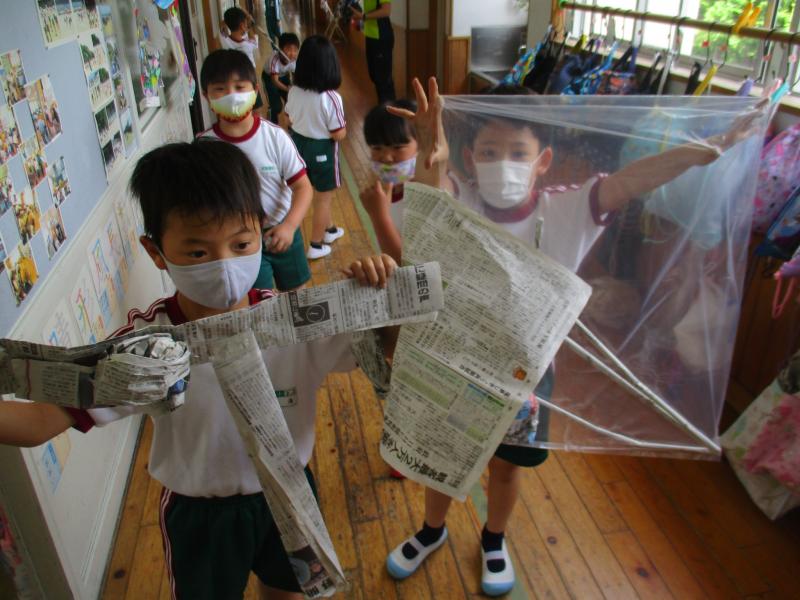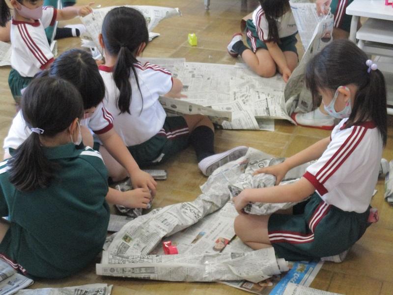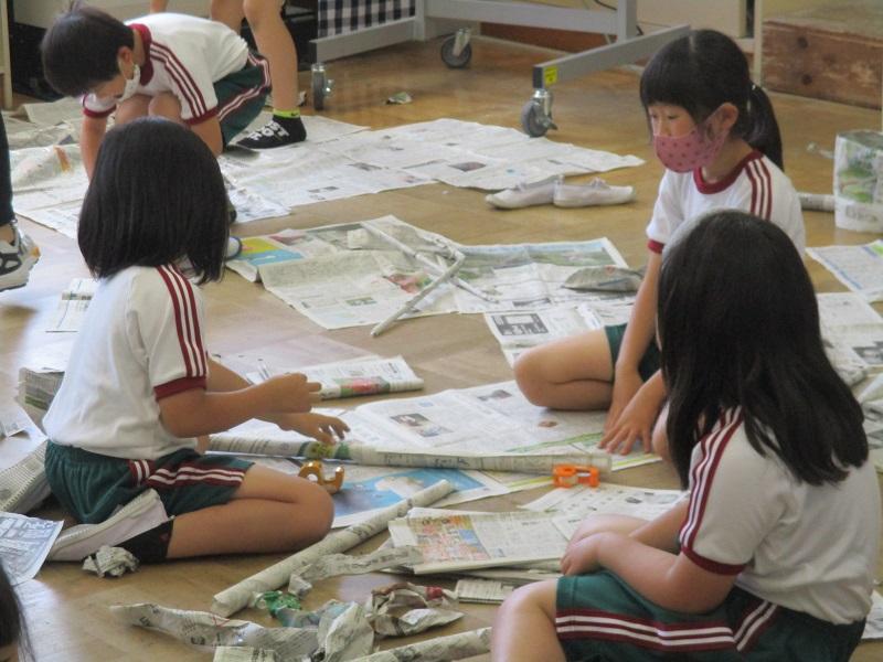 2年生では、「しんぶんしとなかよし」の単元で、新聞紙を使っていろいろなものをつくっていました。