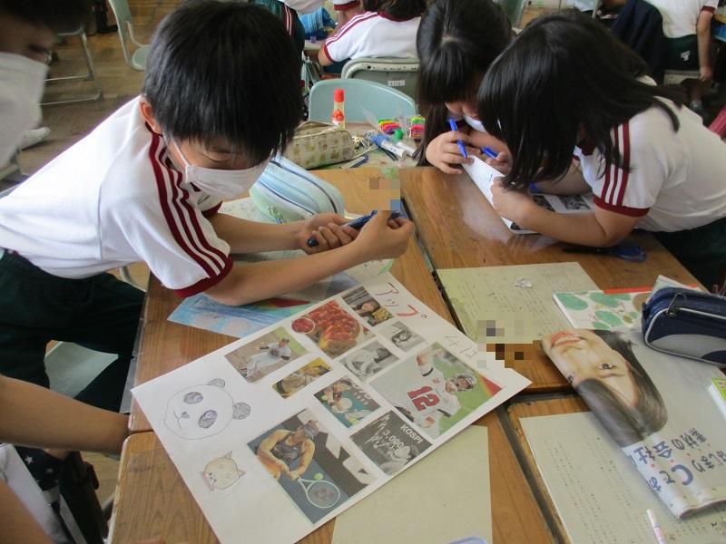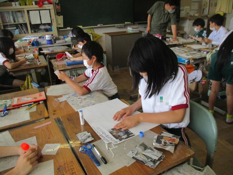 4年生は「アップとルーズ」の単元で実際に新聞を切り取り、グループでまとめる学習を行っていました。