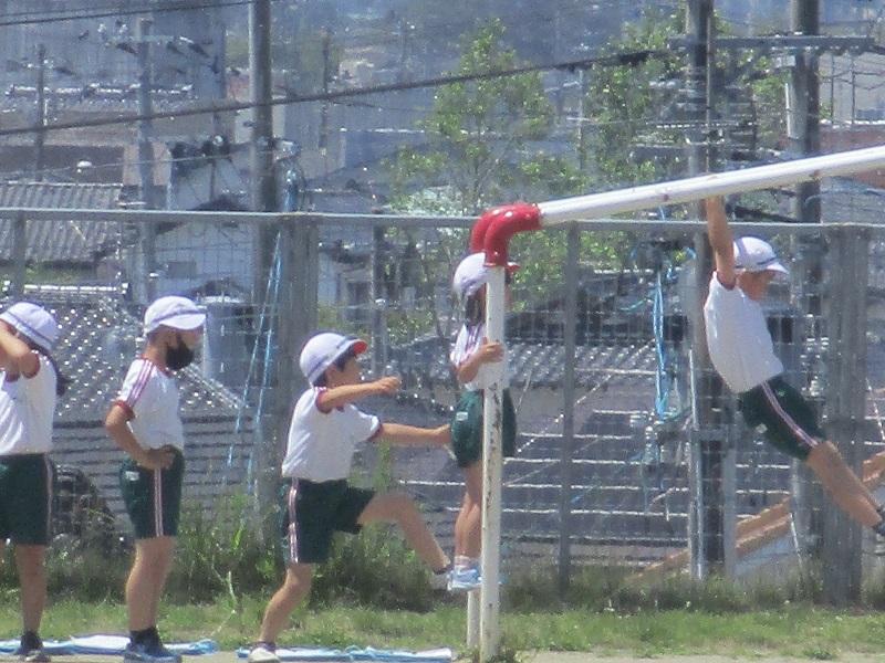 晴天の中、2年生は校庭で元気に体育の授業を行っていました。整列も上手にでき、鉄棒運動に挑戦していました。