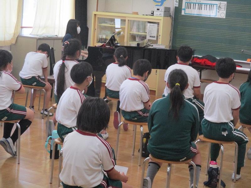 音楽室から歌声が聞こえてきました。5年生が校歌の練習をしていました。
