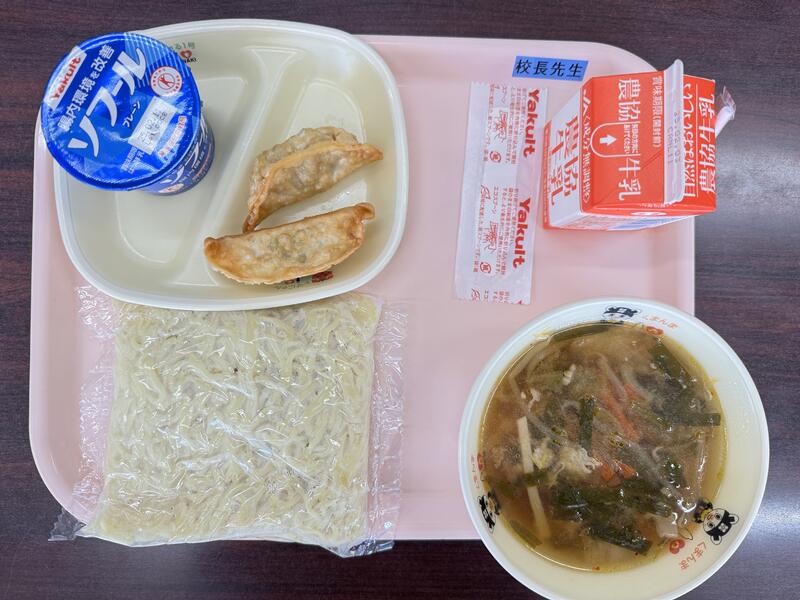 今日は,牛乳、みそラーメン、揚げ餃子、ヨーグルトが出ました。