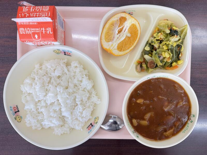 今日は、牛乳、ごはん、キャベツとウインナーのソテー、磐農産ビーンズシチュー、いよがんが出ました。