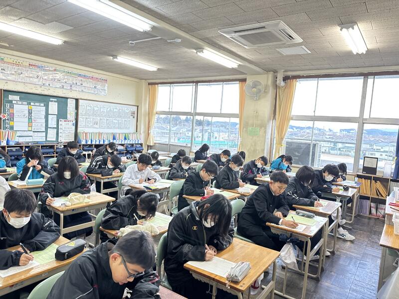 毎日、1枚ずつ英単語書き取りの課題プリントを行い自己採点し間違いがないか確認しています。各学年一番頑張ったクラスが表彰されるので、学級全員で学力が向上するように頑張っています。
