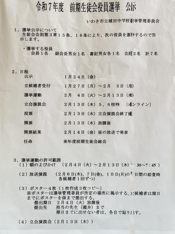 令和7年度の前期生徒会役員選挙が公示されました。現1,2年生がいよいよ植田中をリードすることになります。植田中の学校生活をより良くしようとする意欲をもった生徒が多く立候補することを期待します。