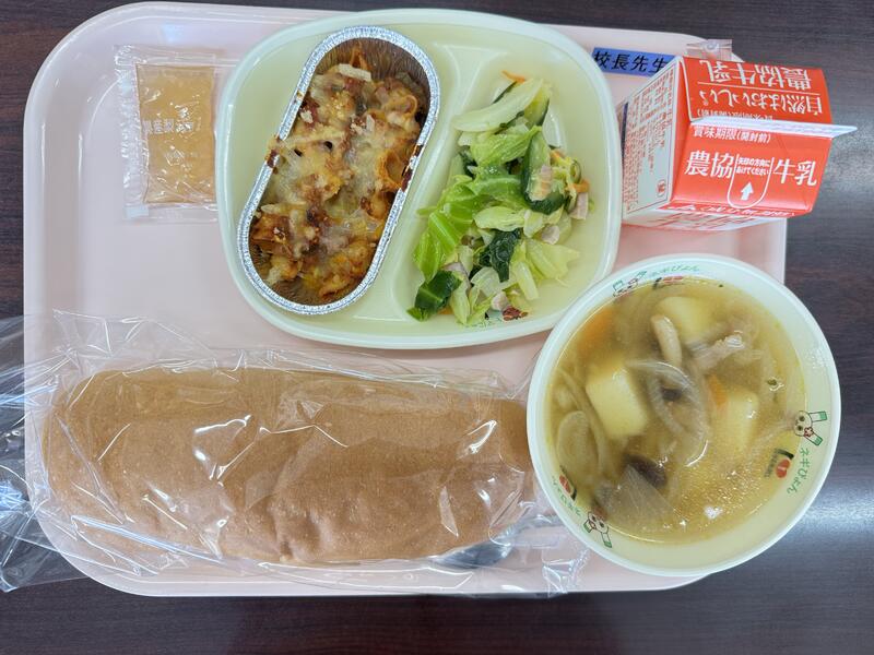 今日は、牛乳、コッペパン、梨ジャム、ネギぴょんグラタン、野菜とハムのサラダ、オニオンスープが出ました。