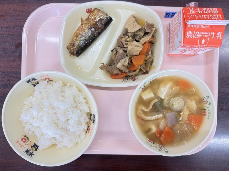 今日は、牛乳、ごはん、いわしの梅煮、豚肉のうま煮、呉汁が出ました。