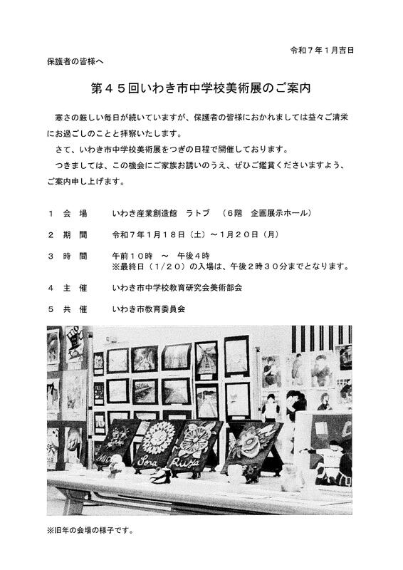 いわき市中学校美術展が1月18日(土)~1月20日(月)、ラトブ6階企画展示ホールで行われ、本校生徒の作品が多数入賞し展示されます。ぜひご覧いただきたくご案内申し上げます。
