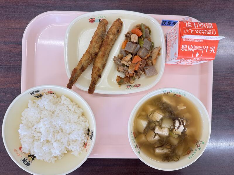 今日は、牛乳、ごはん、ししゃもフライ、こんにゃくのおかか煮、もずくと豆腐のみそ汁が出ました。