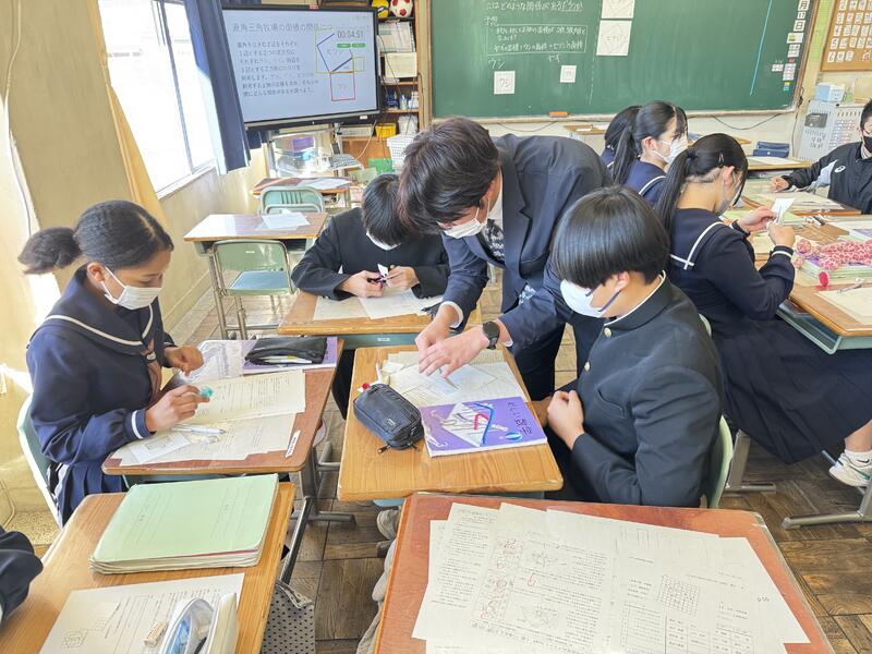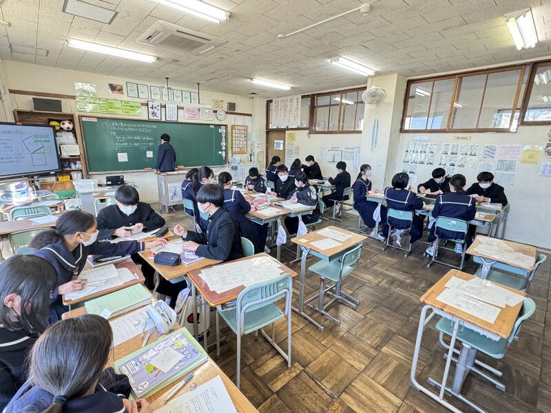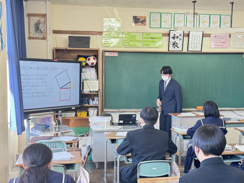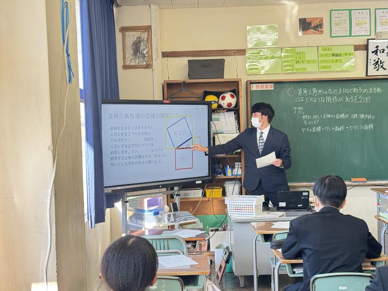 3年1組で数学の研究授業を行いました。直角三角形の各辺を一辺とする3つの正方形の面積の関係性を見出す授業でしたが、各自主体的にそれぞれの面積を出して関係性に気づくことができていました。今日の授業で学んだ「三平方の定理」が生活場面でも活用されていることを知り、数学の楽しさを感じてほしいと思います。