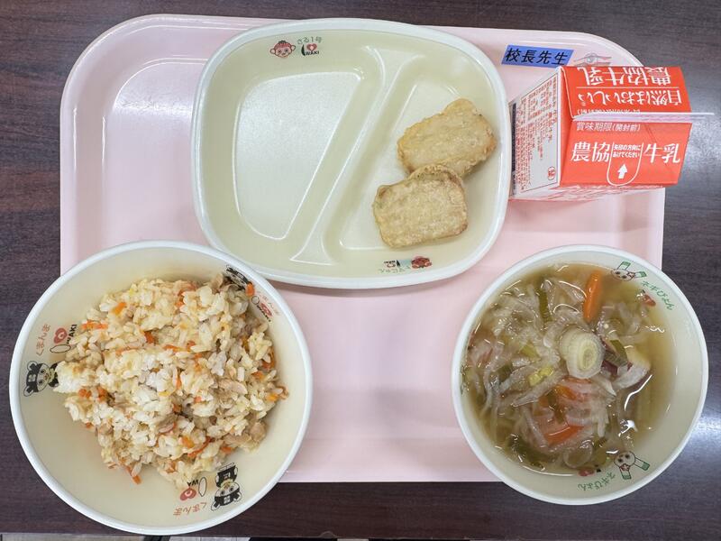 今日は、「ふくしま健康応援メニュー」で牛乳、ツナごはん、豆腐と野菜のナゲット、野菜の甘味たっぷりみそ汁が出ました。