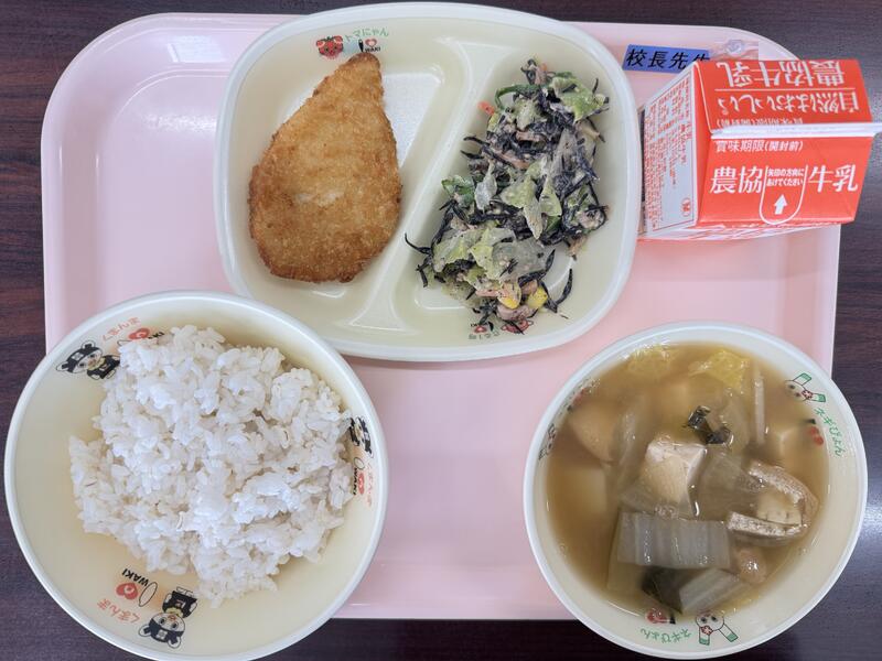 今日は、牛乳、麦ごはん、かれいフライ、ひじきのごまマヨネーズ和え、大根と白菜のみそ汁が出ました。