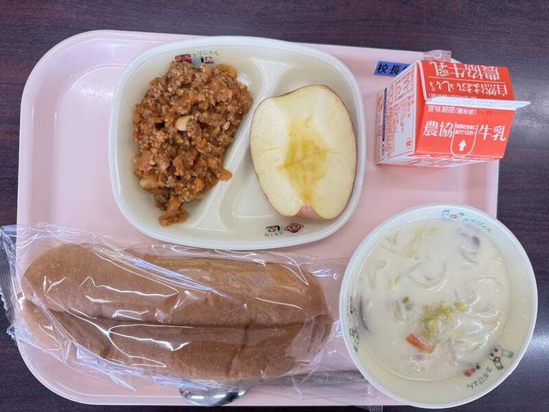 今日は、牛乳、ドックパン、チリコンカン、白菜シチュー、リンゴ雅出ました。
