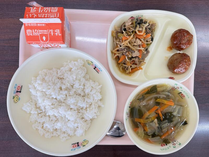 今日は、牛乳、麦ごはん、ビビンバ、肉団子、春雨スープが出ました。