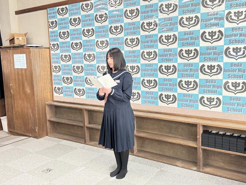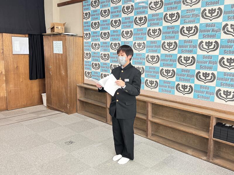 第2学期終業式で各学年の代表生徒が、「2学期の反省と冬休みの抱負」について発表しました。2学期頑張ったことや反省点、冬休みにやりたいこと、頑張ることなどを堂々と発表してくれました。