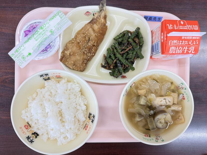 今日は、牛乳、ごはん、いわしの揚げびたし、いんげんのゴマよごし、なす汁、グレープゼリーが出ました。