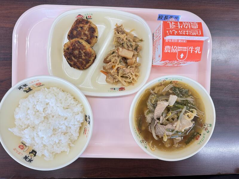 今日は、牛乳、ごはん、県産とりつくね、切干大根と小松菜の油炒め、ユッケジャンスープが出ました。