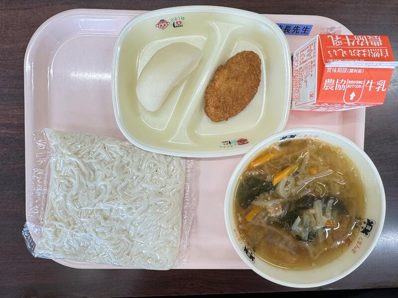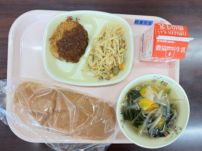 今日は、牛乳、コッペパン、メンチカツ、ツナスパゲッティ、野菜スープが出ました。