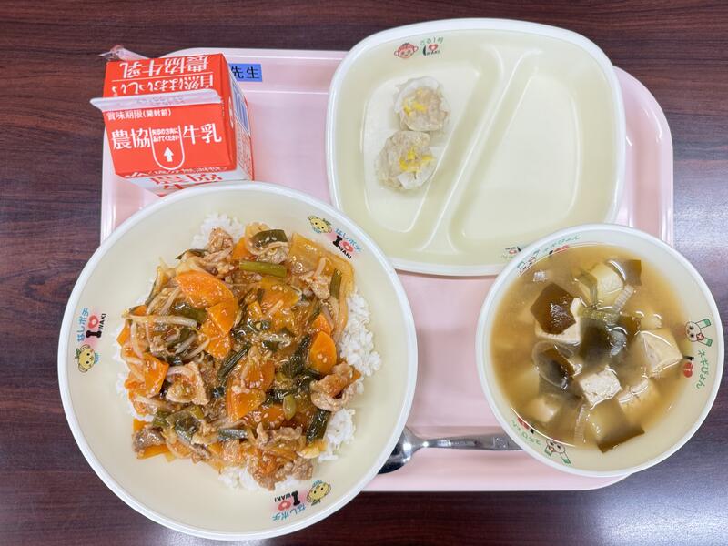 今日は、牛乳、トマにゃんキムチ丼、コーンシュウマイ、ジャガイモとわかめの味噌汁が出ました。