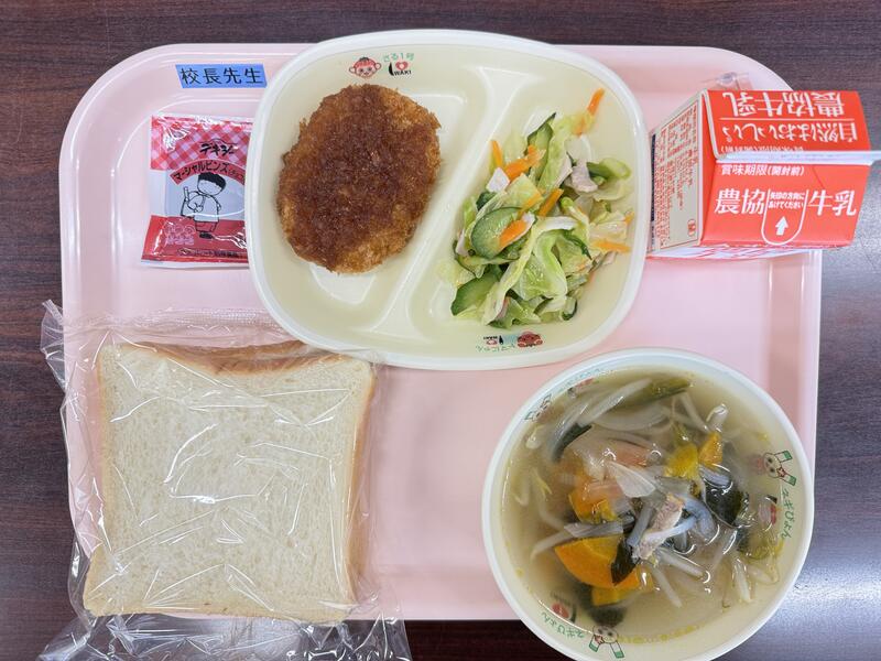 今日は、牛乳、食パン、マーシャルビーンズ、豚肉のコロッケワインソースがけ、キャベツとハムのサラダ、野菜スープが出ました。