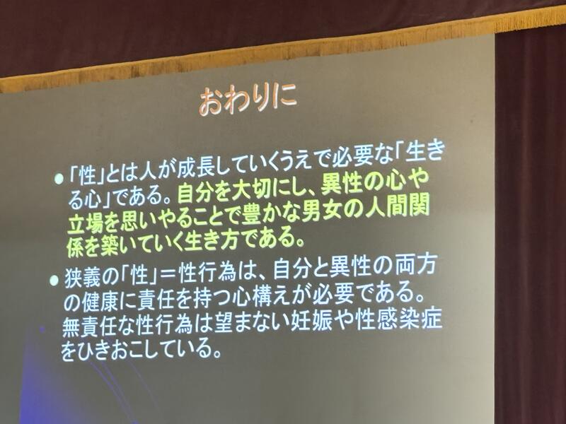 3年生にとっては進学先等の進路選択の時期が近づき、2年生にとっても自分の将来について考えなければならない時期となっていますが、それと同じように大切な「性」について、今日聴いた話が自分のこれから、そして将来に活きてくることを期待しています。