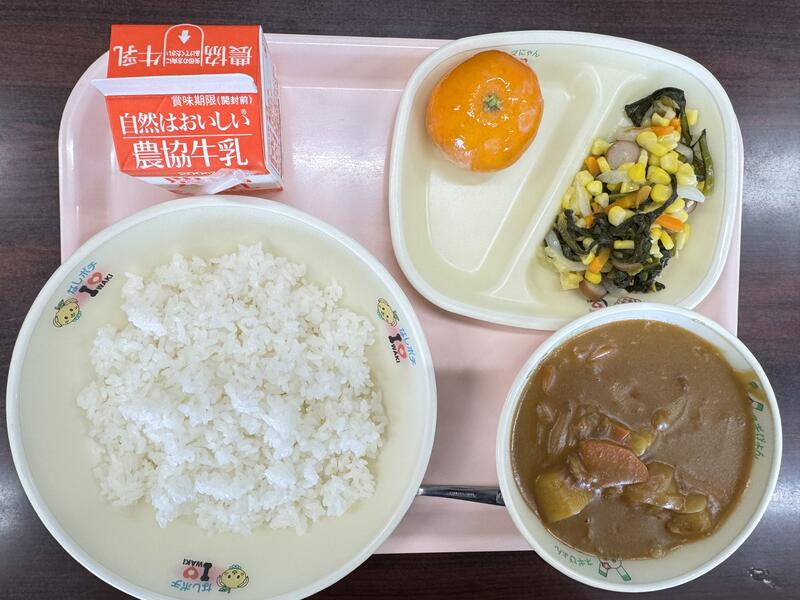 今日は、牛乳、ポークカレーライス、小松菜とコーンのソテー、冷凍みかんが出ました。