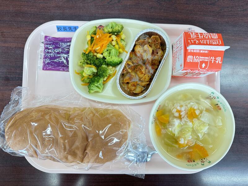 2024年6月26日 12時30分今日は、牛乳、コッペパン、ブルーベリージャム、ネギぴょんグラタン、ブロッコリーとコーンのサラダ、大麦入り野菜スープが出ました。