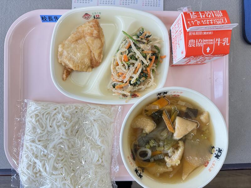 本日は、牛乳、きつねうどん、とり天、ほうれん草のごま和えが出ました。