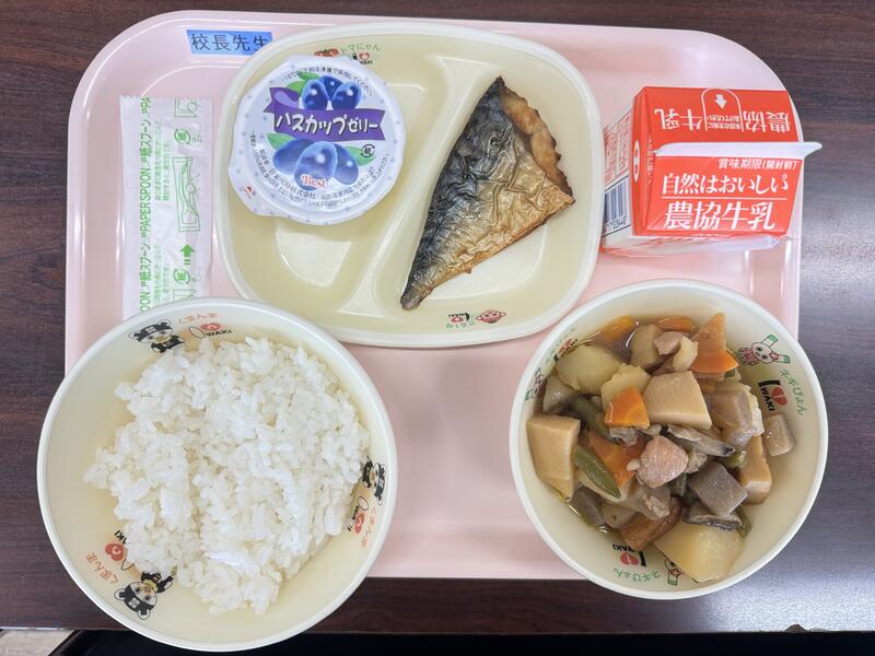 今日は、牛乳、ごはん、サバの昆布醤油焼き、筑前煮、バスカップゼリーが出ました。