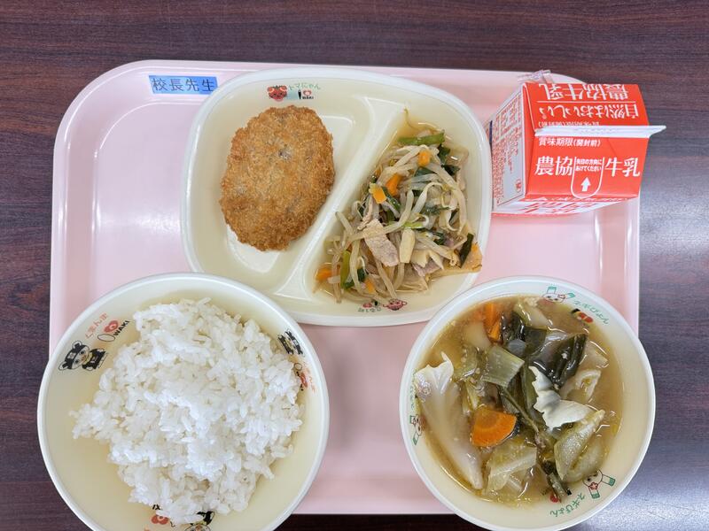 今日は、牛乳、ごはん、イカメンチカツ、もやしと豚肉の油いため、みそ野菜スープが出ました。