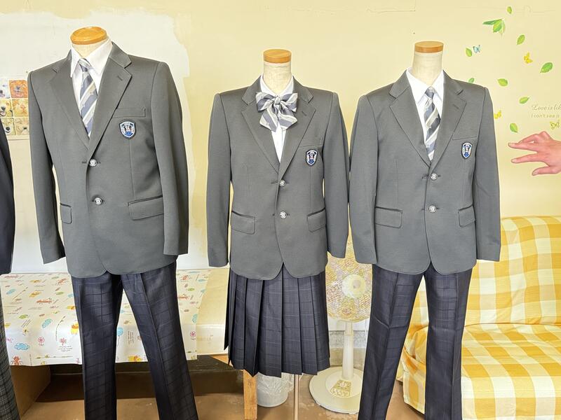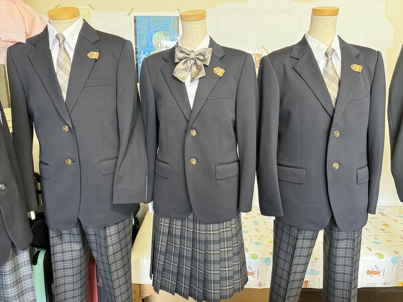 3パターンの制服を見本として用意してくれました。来年度の新入生に間に合うように今後、保護者アンケート、検討委員会等を通して決めていくことになります。(女子はスカート又はズボンを選択できるようになります。)
