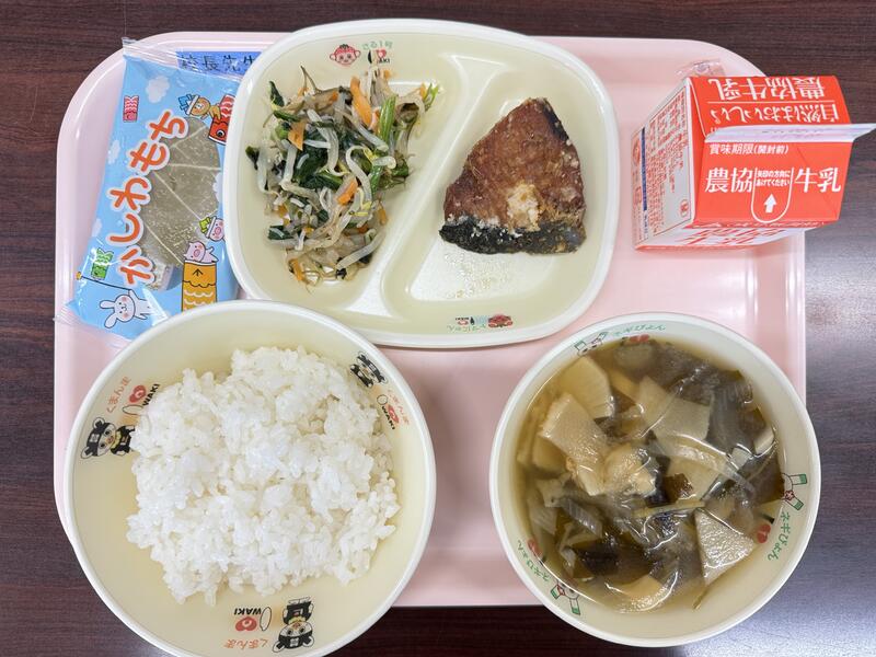 今日は、こどもの日献立で牛乳、ごはん、かつおの揚げ浸し、磯和え、若竹味噌汁、柏餅が出ました。